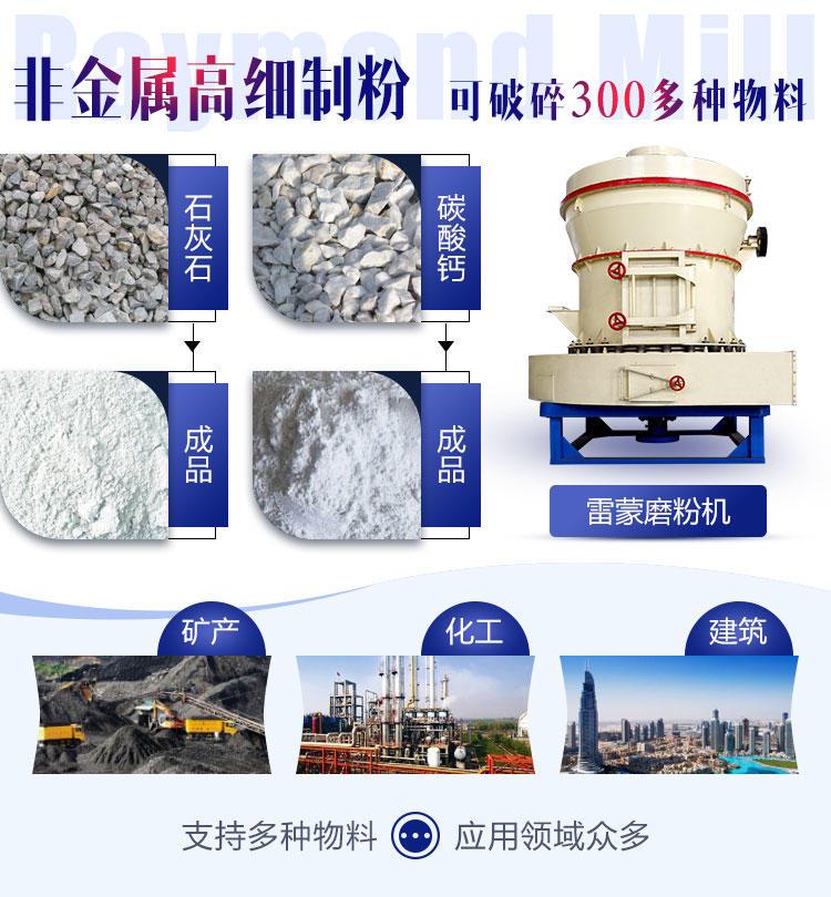 高压悬辊磨粉机适用于矿业、建材、化工、冶金等行业, 可对石英石、长石、重晶石、萤石、白云石、石榴石、碳化硅、铝钒土、锆英砂、大理石、方解石、铁矿石、磷矿石、煤块、陶瓷、矿渣等莫氏硬度不大于9.3级, 湿度在6%以下的400余种非易燃易爆物料进行磨粉加工,成品粒度30-425目之间可以调节。
