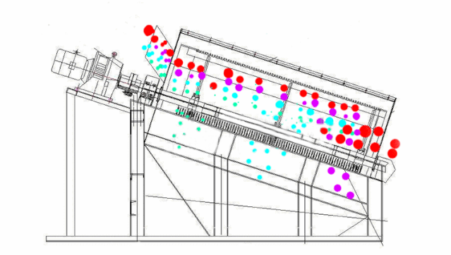 滚筒筛的工作原理是电动机通过减速器、联轴器驱动倾斜安装于机架上的滚筒绕其轴线转动;当物料进入滚筒后,由于滚筒的倾斜与转动,筛面上的物料不断翻转与滚动的同时,自上而下通过分级筛网析出,由于筛网规格不同,物料逐渐被分离筛选,粒度合格的物料(筛下物)经筛分后落入到各自的下料斗中,不合格的物料(筛上物)经滚筒尾部的排料口排出。